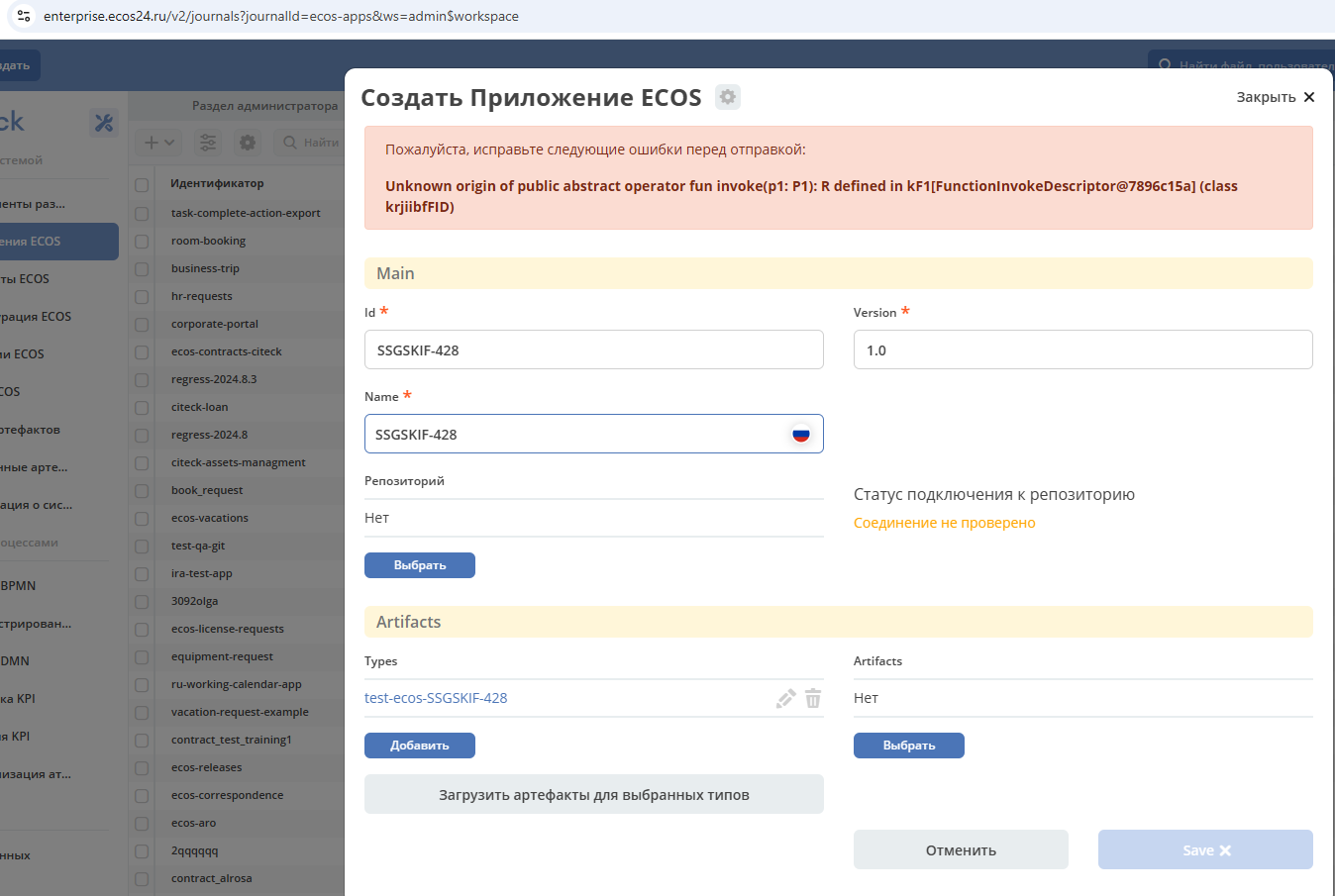 Невозможно создать приложение ECOS. При создании возникает исключение eapps.log