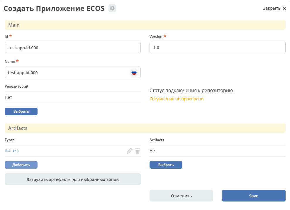 3. На форме заполнить обязательные поля и выбрать в артефактах один тип