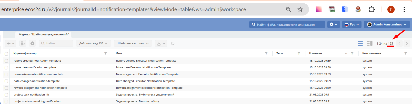Открылся журнал, где счётчик показывает 155 записей.