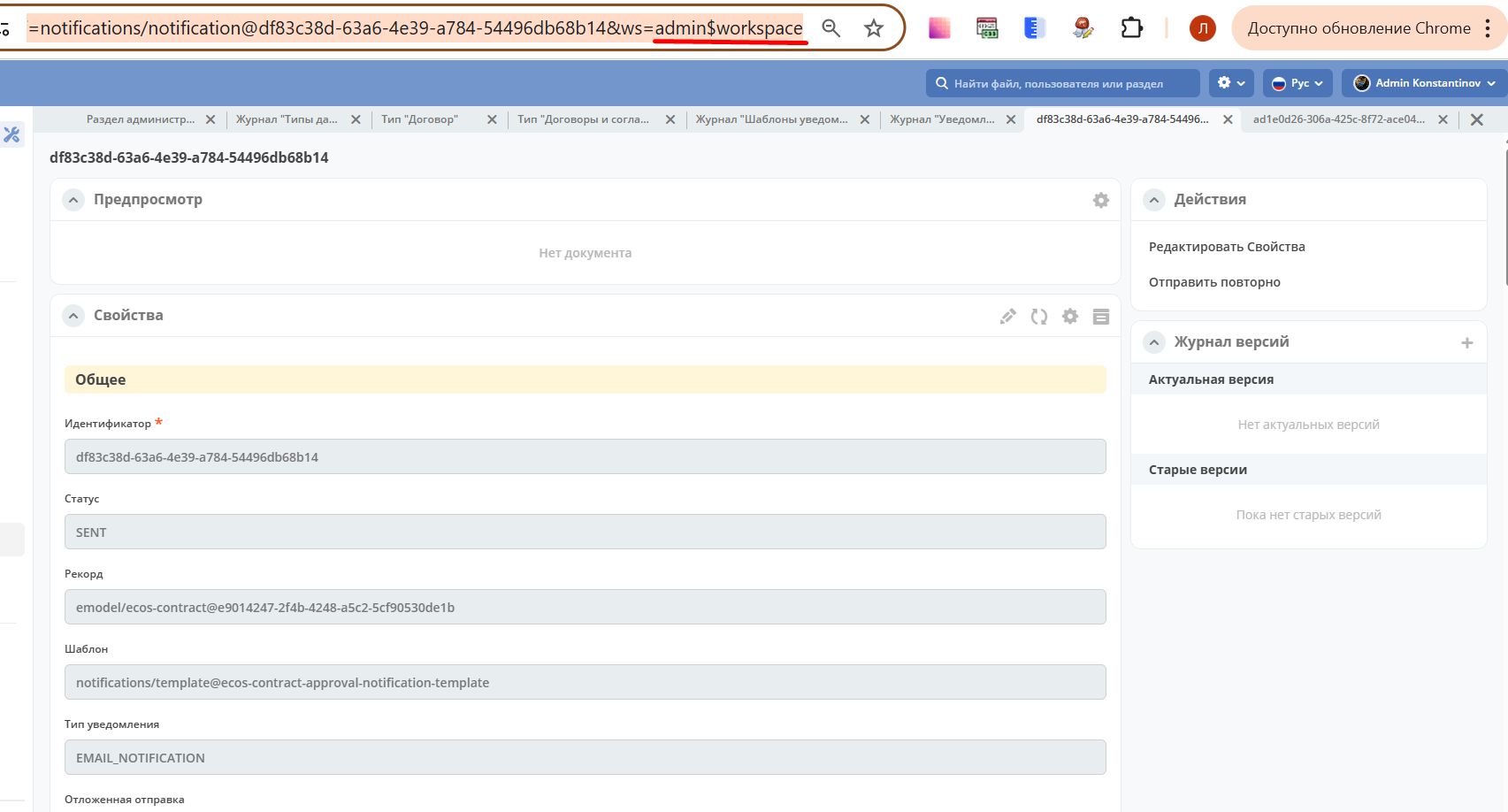 Отправленное уведомление отображается в журнале "Уведомления" ws "Раздел администратора".